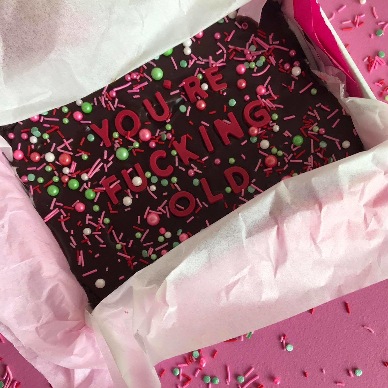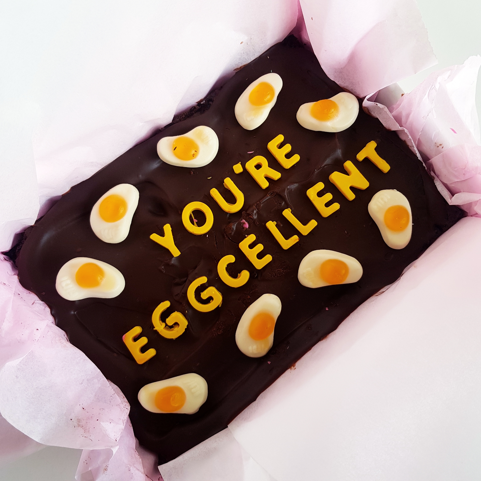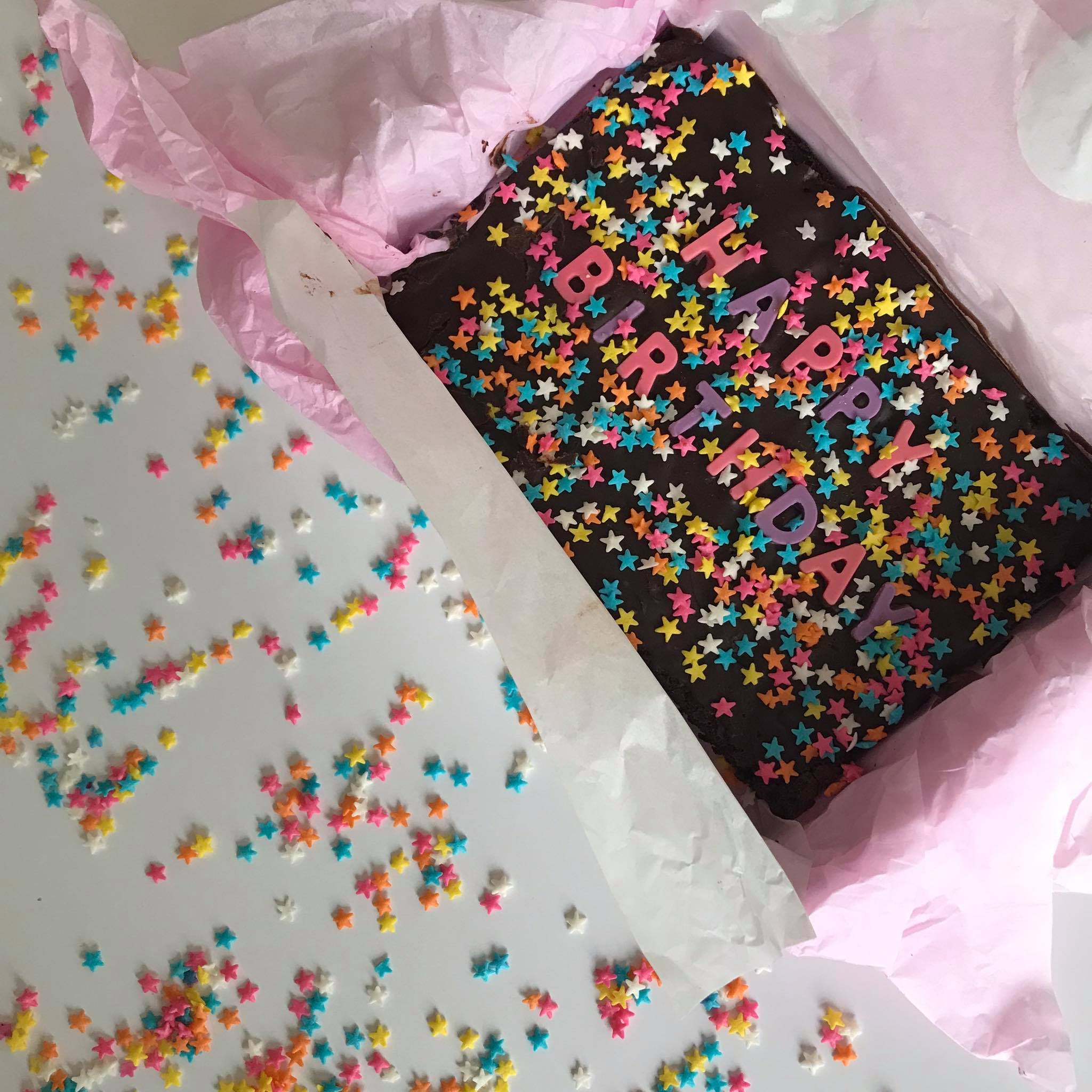 The brownie comes in a whole piece but is the size of 6 pieces of our classic Belgian dark chocolate brownie topped in rich chocolate ganache, chocolate lettering and sprinkles.
