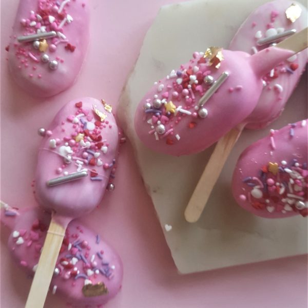 Dipped in coloured white chocolate and sprinkled with matching sprinkles. Please put your colour choice in the text box below.