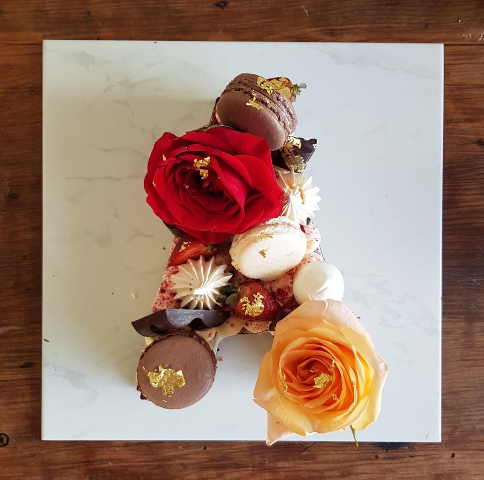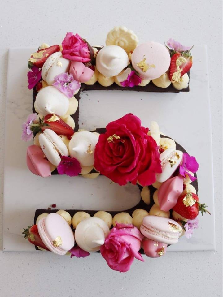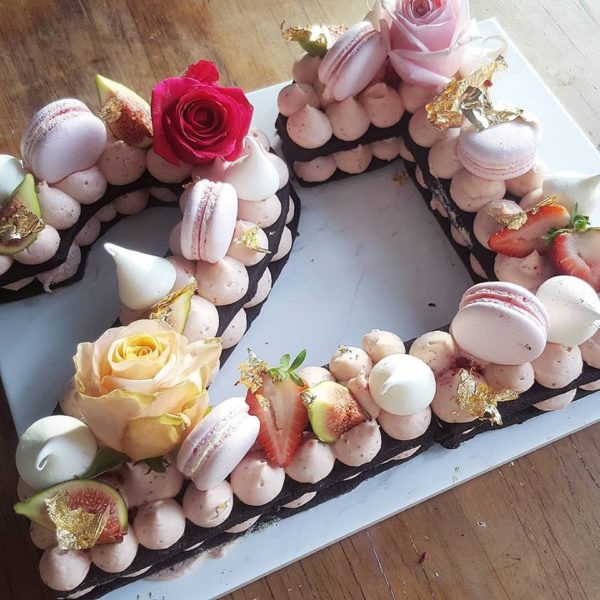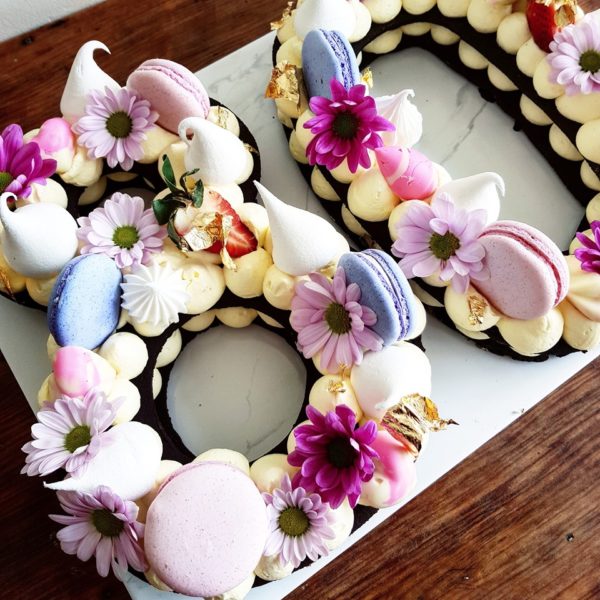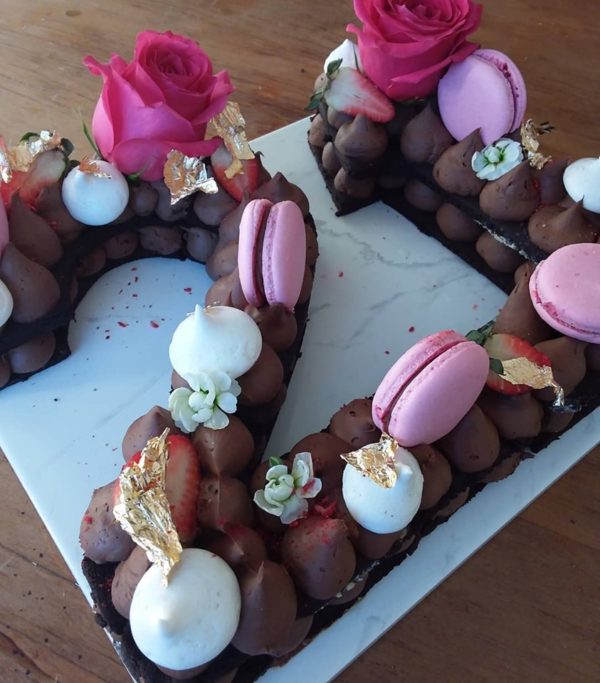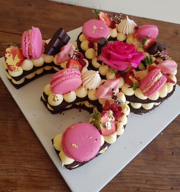 Cookie cakes come decorated with flowers, chocolates, meringues, macarons and fruit. Choose your own colour scheme, and let us know. If you don’t select a colour scheme the cake will be made to pink and gold as per the main image.