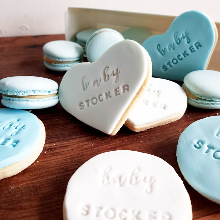 Cookies can be made with custom stamps to match your font and theme (including images) for an additional $15. Email us to enquire