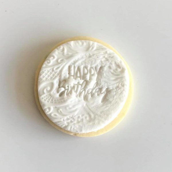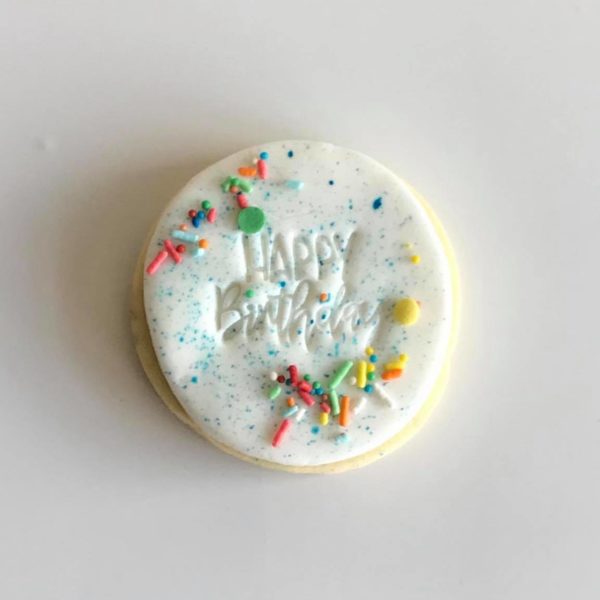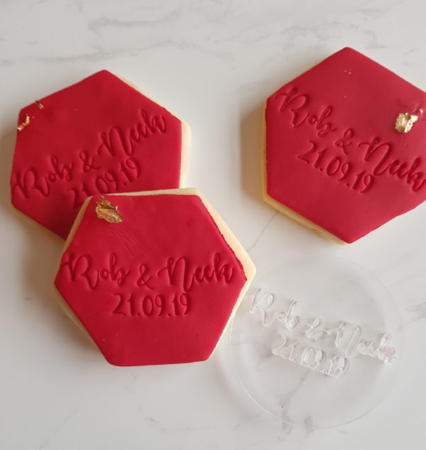 Formatting and font used is at our discretion. Cookies can be made with custom stamps to match your font and theme (including images) for an additional $20. Email us to enquire
