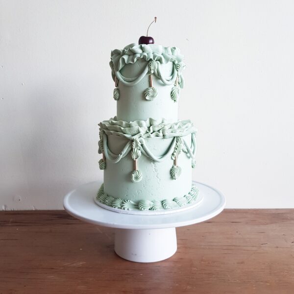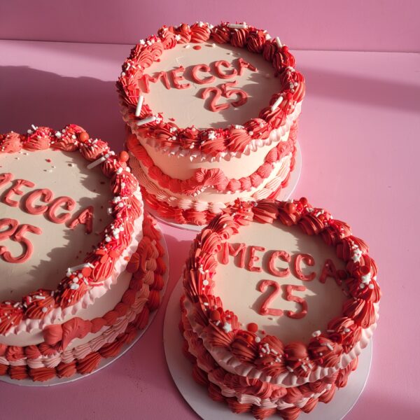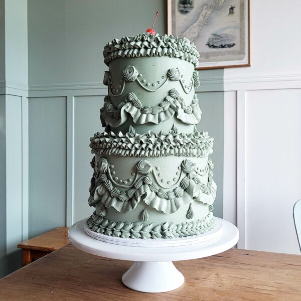 Each cake is made up of two layers of cake and one layer of filling and stands 4″ tall. It is covered in a pastel coloured vanilla Italian buttercream