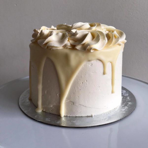 A white on white cake filled with coloured internal buttercream. Decorated with white buttercream, macarons, meringues and a gold splatter