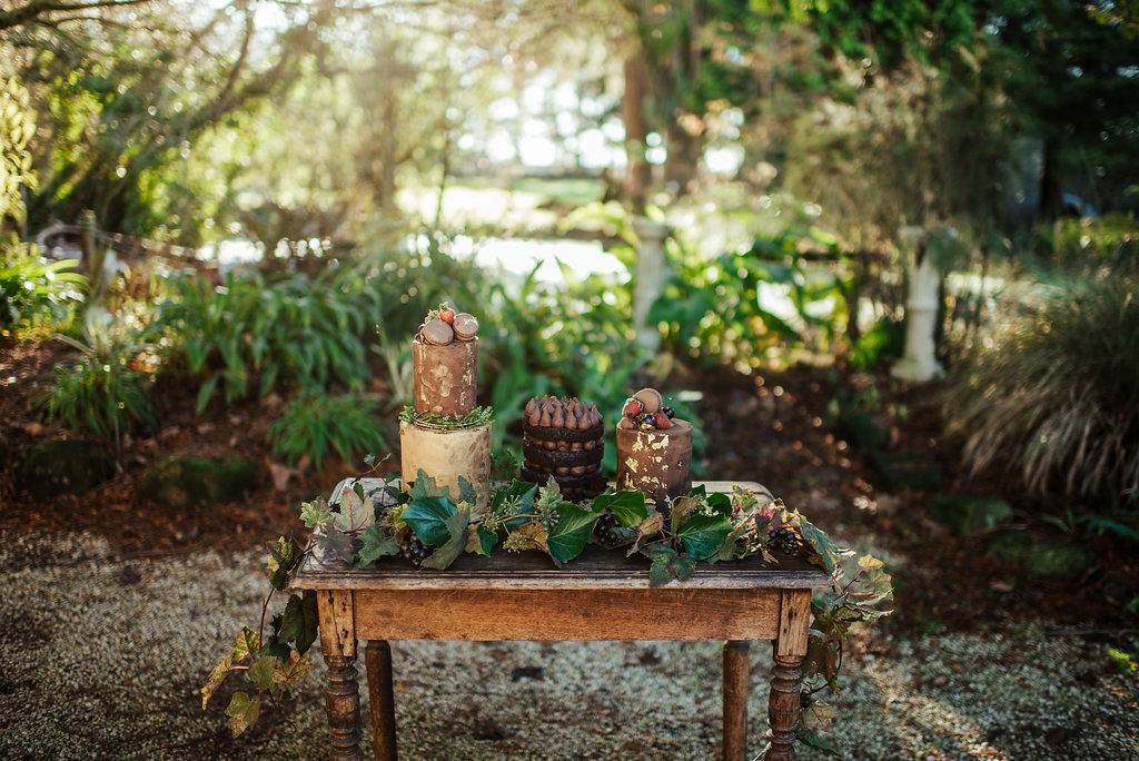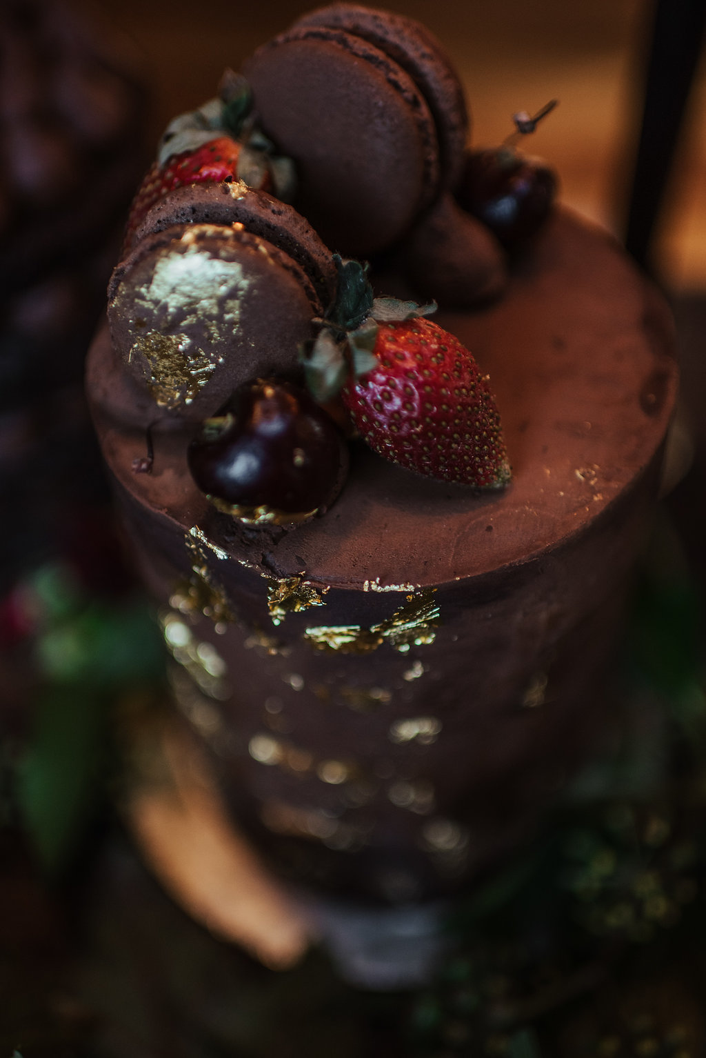 We kept the cakes simple, a sweet classic trio of chocolate cakes. Naked and ganached with gold paint and gold leaf. The perfect combination of the natural elements with the elegant gold.